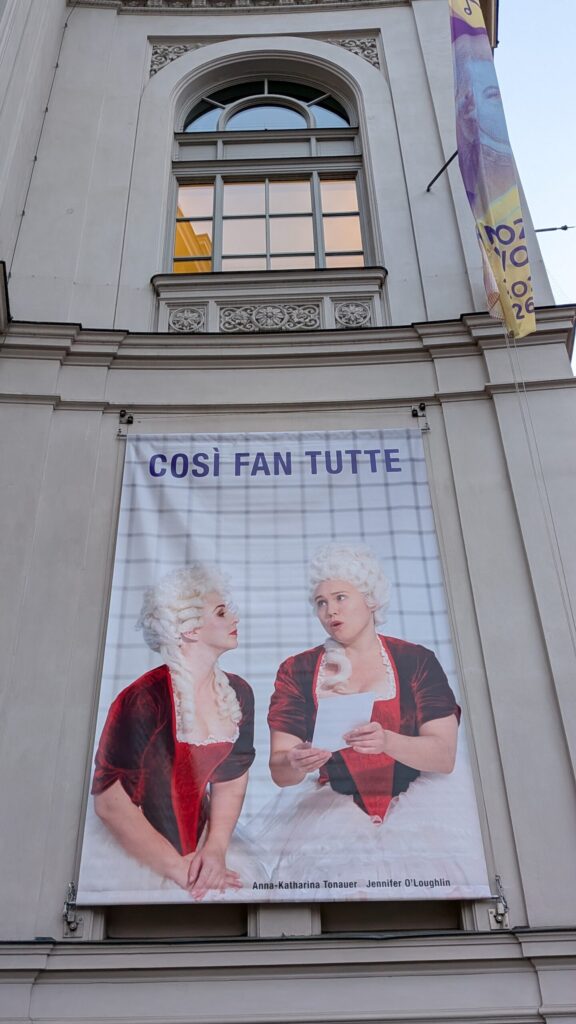 Der Musikkurs der 12. Klasse besuchte am Sonntag, den 08.03., eine Aufführung der Oper „Così fan tutte“ im Gärtnerplatztheater. Der Opernbesuch stand im Zusammenhang mit dem aktuellen Unterrichtsthema „Musiktheater der Klassik“, mit dem sich die Schülerinnen und Schüler derzeit im Musikunterricht beschäftigen. Das Werk wurde im Vorfeld im Unterricht vorbereitet, sodass Handlung, Figuren und musikalische Besonderheiten bereits bekannt waren. Für viele der Schülerinnen und Schüler war der Besuch einer Oper jedoch eine neue Erfahrung. Umso spannender war es, das im Unterricht behandelte Werk live auf der Bühne zu erleben.